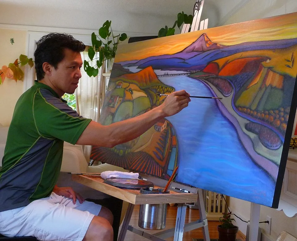 Daniel paints with imagination but not from imagination. Each landscape painting is inspired from an actual place. He creates composition in a simplified form with designs of shapes and patterns found in the nature world. One could speculate his designs are influenced by Fauvism. Daniel is definitely a colorist. With a dry-brush technique, he applies acrylic paints in layers to develop bold vivid colors to bring out eye-catching contrast in his designs. It is his own whimsical interpretation of each individual scene that sets his paintings apart from typical landscape painting.